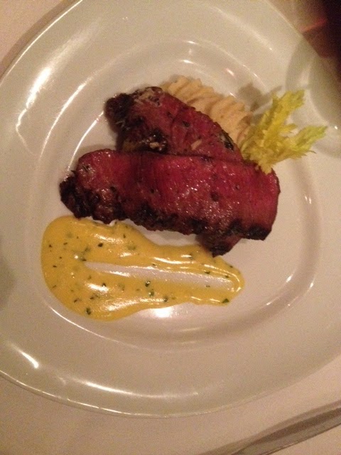 Finally, the piece de resistance of the meal that everyone was waiting for with anticipation arrived; an entrée of slices of grilled ostrich served on a pile of grilled Brussels sprouts and chanterelle mushrooms with a lovely creamy mound of artistically beveled celery root and potato purée pushed through a pastry bag. The ostrich, cooked to rare, had the texture of bison and the appearance of the dark meat of a duck and was incredibly tender served with a slather of brandy flavored béarnaise sauce.  We all loved it but could not eat the generous portion and collectively we decided to take the leftover portion home for an ostrich omelet on Sunday.  This course was served with a 2008 La Perla de Priorat Noster Priorat Templari from Spain, a blend of mostly Grenache and Carignan with some Syrah according to the daughter.  The age of the wine had relaxed the Grenache into a very pleasant drinkable wine, our second favorite wine of the evening.