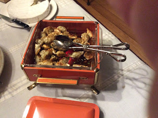 November 30, 2017. Lunch – Vinaigrette Dinner- Cedar Plank Grilled Salmon, pot stickers with dipping sauce, and asparagus with sesame seed sauce plus cheeses and desserts.