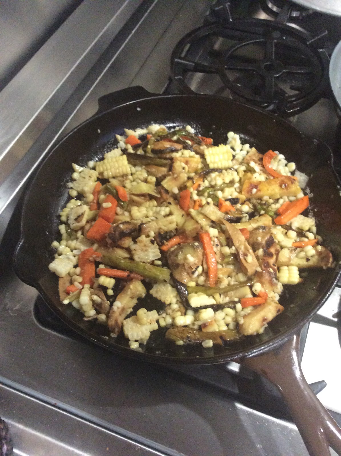 At 7:00 we began to cook a very simple meal. We were too tired to cook a full meal so we used PPIs to fashion a meal. I Sliced and diced ½ Poblano, about ½ cup of Vidalia onion and four or five shitake mushrooms that Suzette put into the skillet and sautéed with the two hamburgers she was cooking.