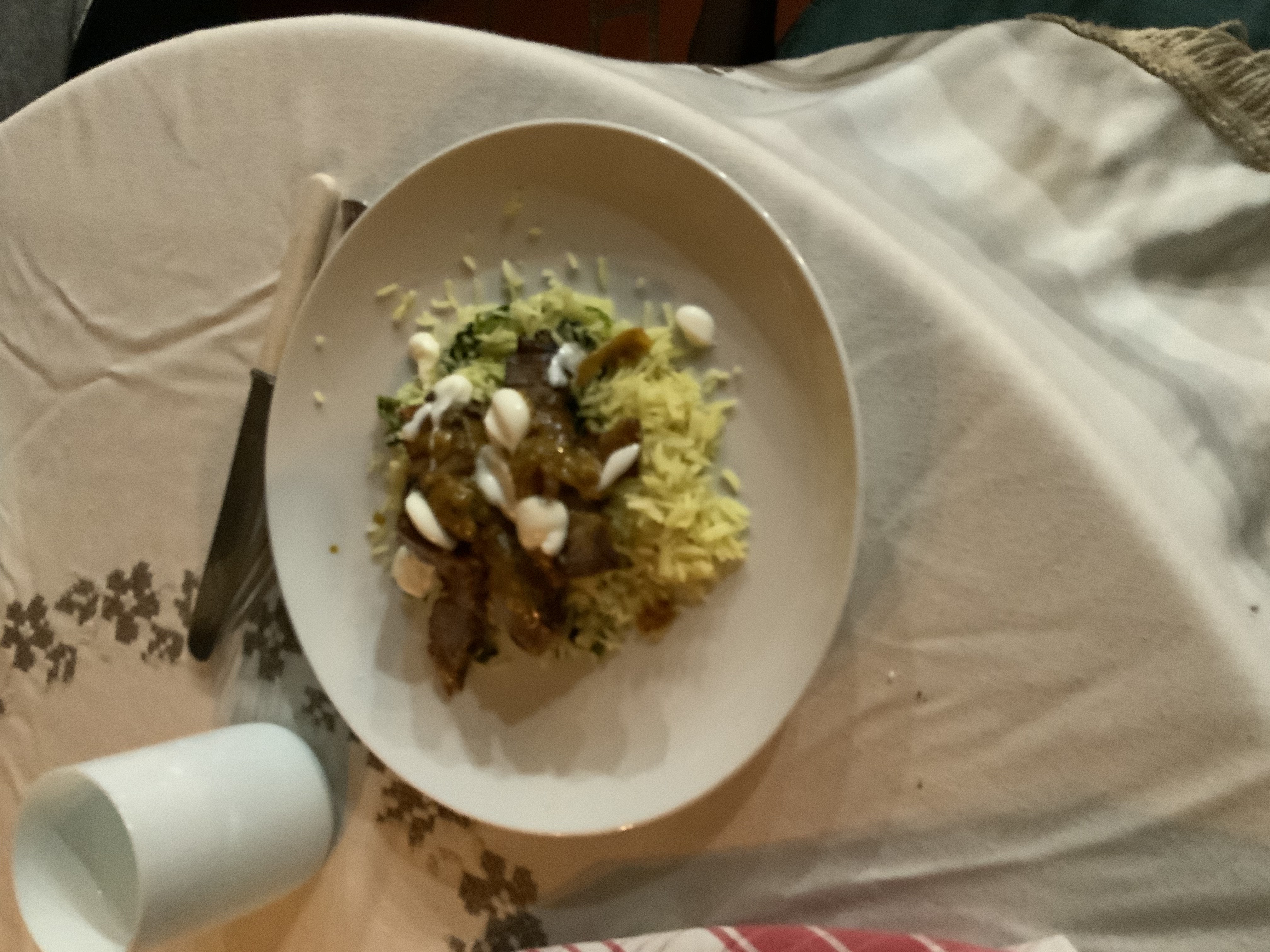Dinner was a quick prep while I went to the bathroom and brushed my teeth, Suzette sautéed several slices of PPI grilled rib steak with the last of the Saag, some of the prepared Turmeric rice, some chopped onion in the last of the lamb korma sauce to create a beef korma. We doused the dish with blobs of yogurt and enjoyed our third Indian meal from the Naan and Dossa prepared dishes. She drank Chianti and I drank water.