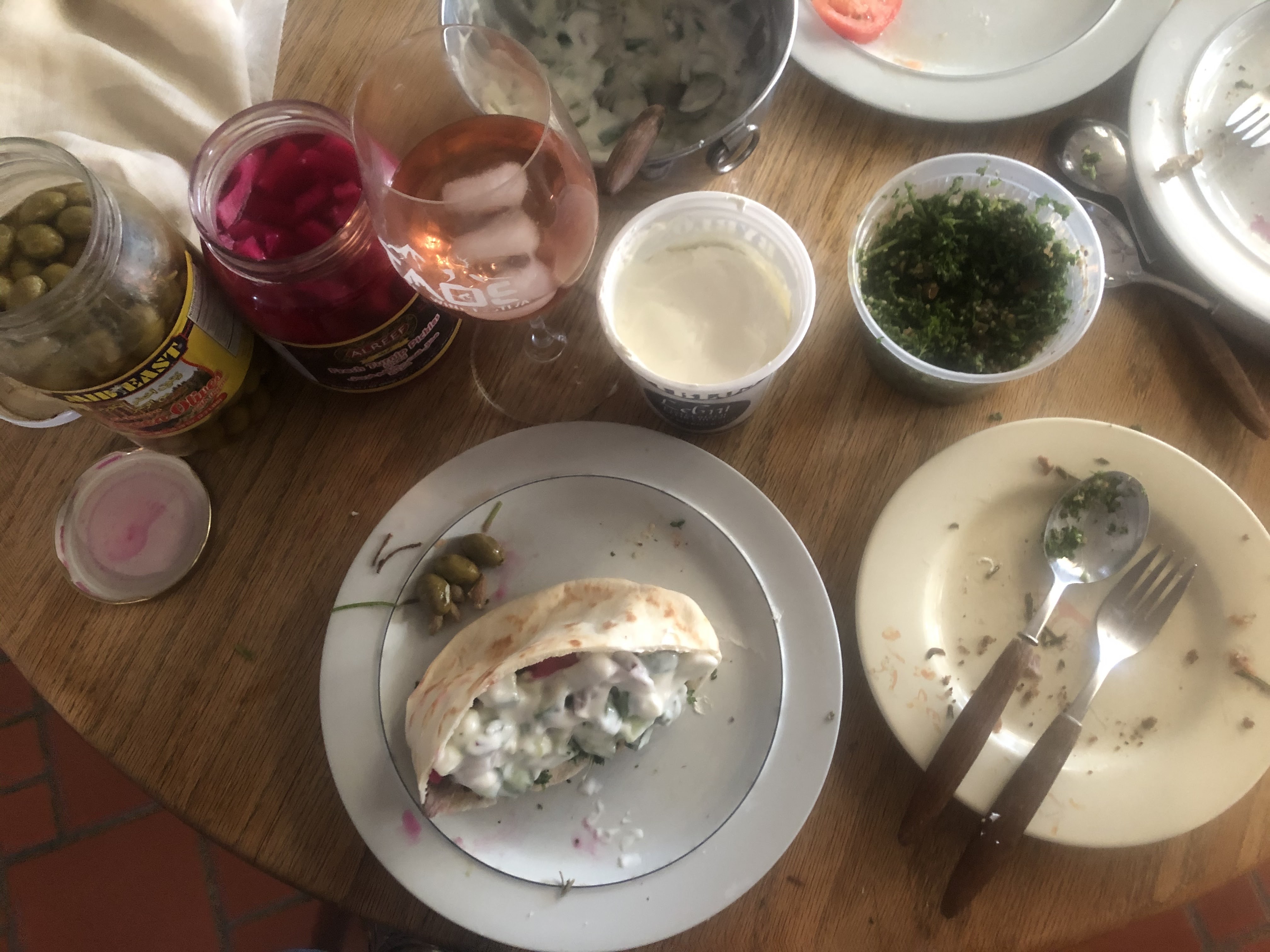 We had a fabulous dinner that would have made the Hedary’s proud. Suzette stuffed her pita with slices of kibbeh, lamb, hummus, tzatziki and tomatoes. I stuffed mine with slices of tomato, labni, tzatziki, Tabouli, and lamb. I also ate the last 1/3 of Suzette’s kibbeh with a wad of hummus and a second pocket sandwich.