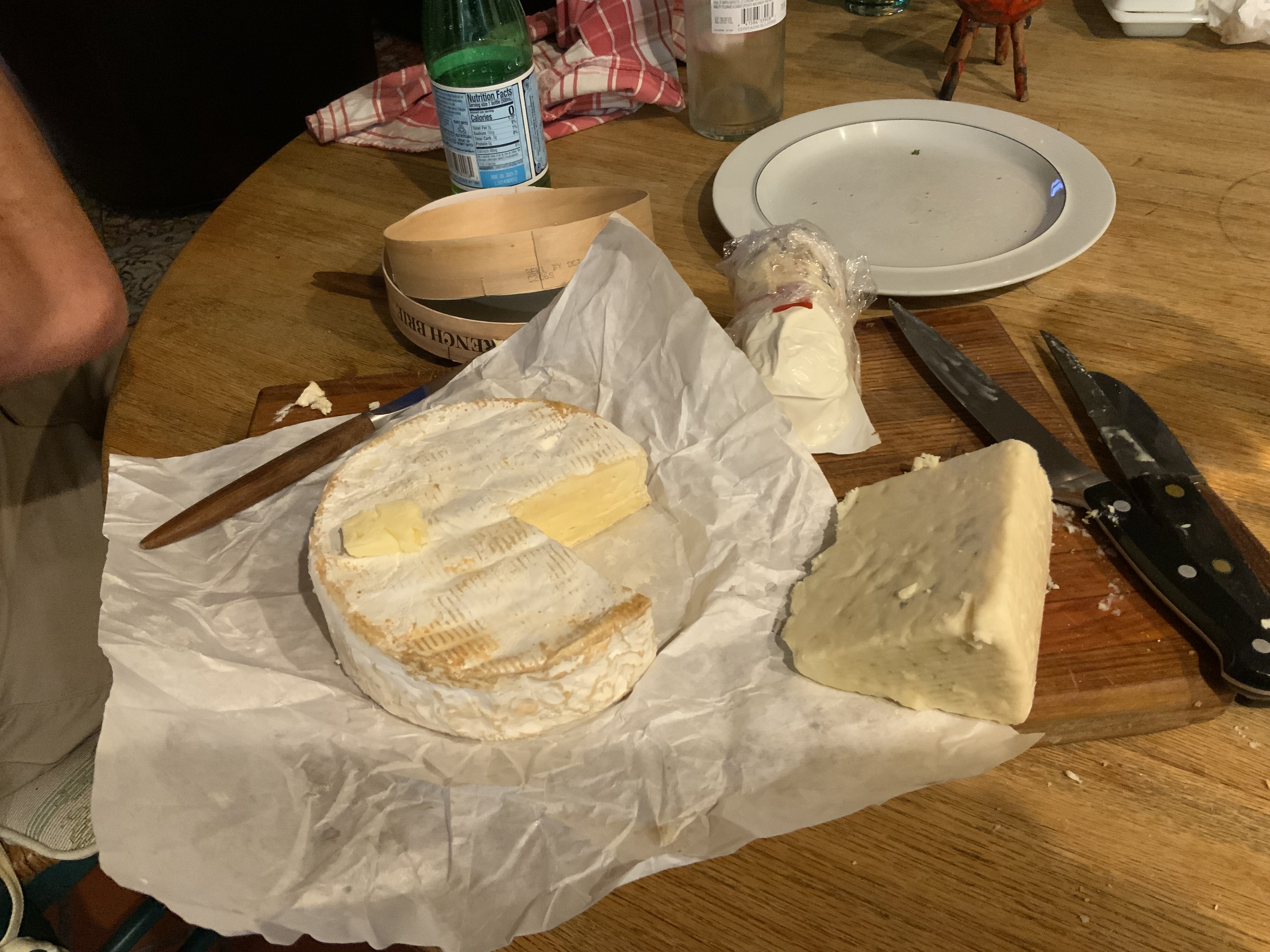 After dinner Willy toasted rounds of baguette and we ate slices of Point Reyes Blue cheese and brie on baguette rounds with the last of the wine.