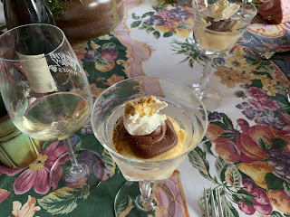 In a few minutes Suzette suggested we eat dessert. We brought in the pumpkin mousse and chocolate sauce filled parfait glasses and Suzette put a dollop of whipped cream on each and a dusting of ground roasted pumpkin seeds and Aaron cut slices of pecan pie and I poured sips of 2019 Wiemer Late Harvest Riesling that had 5.8% residual sugar.